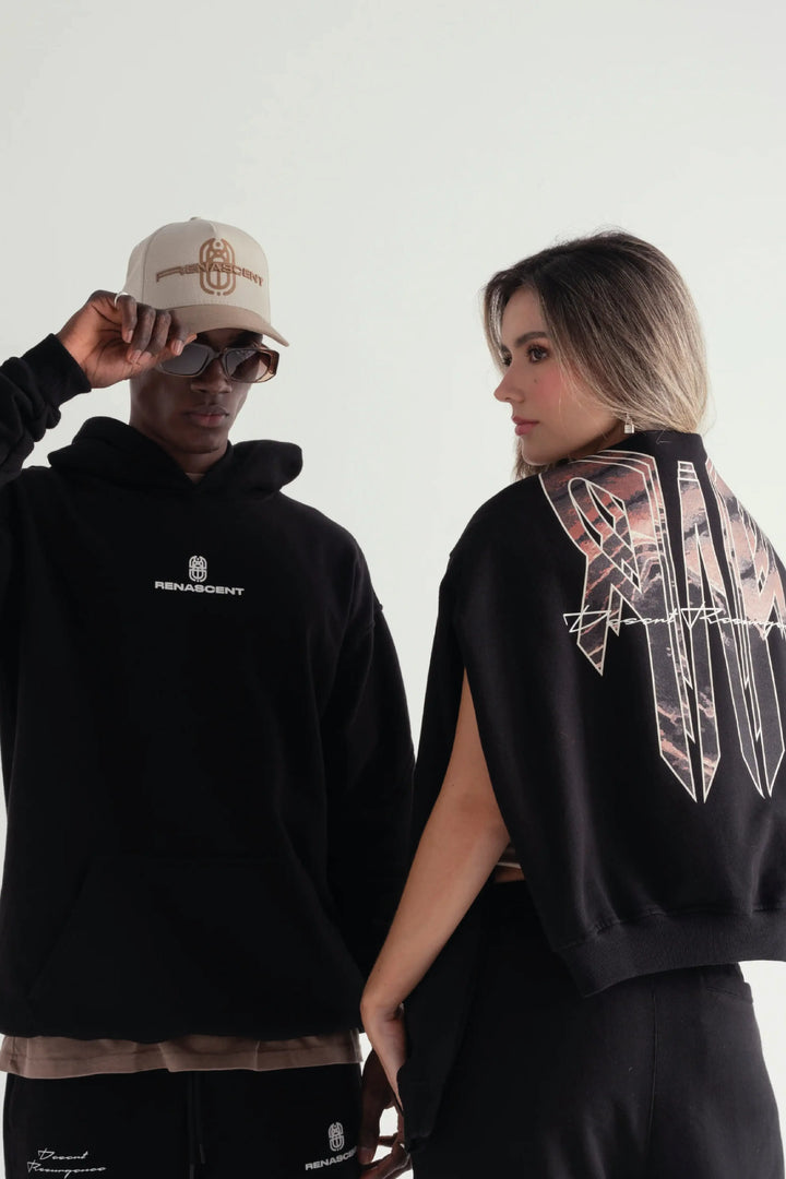 Con una estética marcada por el contraste entre la luz y la oscuridad, los diseños Renascent combinan bordados de precisión, gráficos conceptuales y materiales premium, dando vida a piezas que trascienden la moda para convertirse en declaraciones personales.