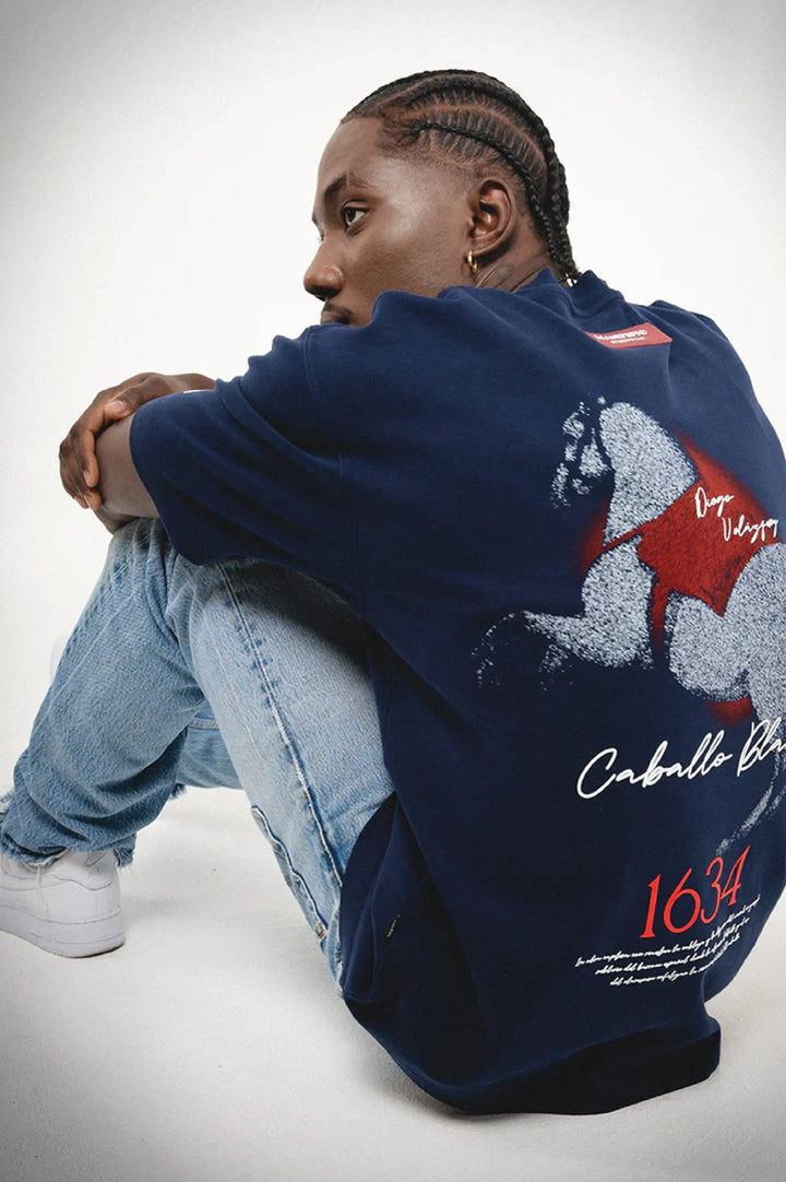 La Camiseta Caballo Blanco evoca fuerza, libertad y pureza a través de una interpretación artística de gran impacto visual. Confeccionada en algodón 100% de 350 g, ofrece una textura gruesa y resistente con una caída estructurada que refleja calidad y presencia. Su diseño en policromía y alta densidad resalta los matices del arte ecuestre, mientras que los acabados en rubber negro y el banderín lateral aportan equilibrio entre elegancia y carácter. Una pieza que combina arte, poder y distinción.
