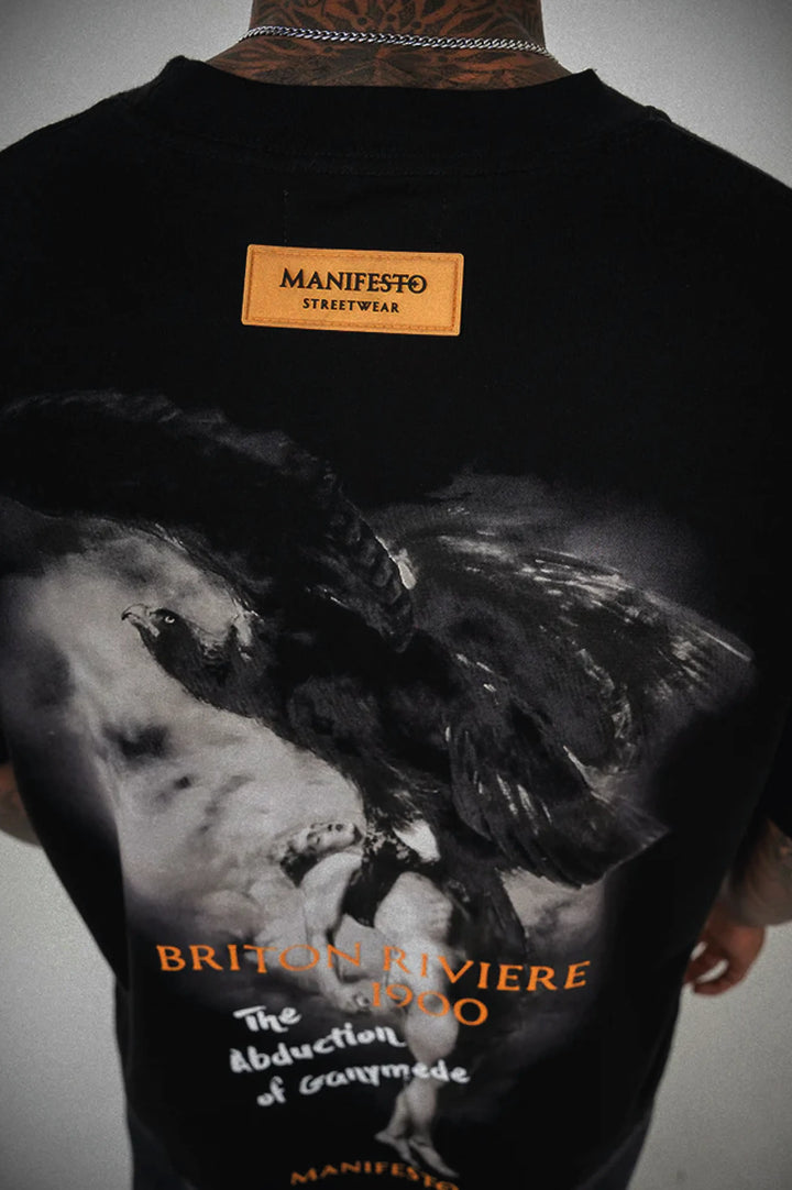 La Camiseta El Rapto representa una visión artística intensa que combina dramatismo visual y elegancia contemporánea. Su confección en algodón 100% de 350 g garantiza una textura gruesa, resistente y de sensación premium, mientras que los estampados en policromía y alta densidad aportan detalle y relieve sobre la base negra. Los acabados en rubber negro y el banderín lateral refuerzan la estética moderna de una prenda diseñada para destacar por su presencia y carácter.