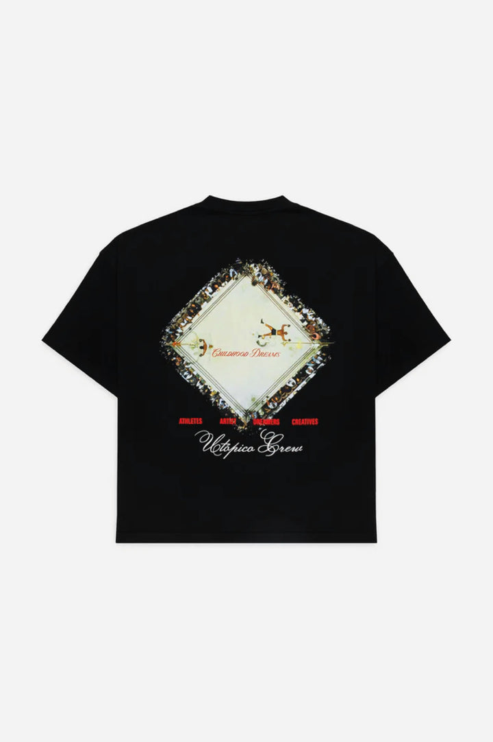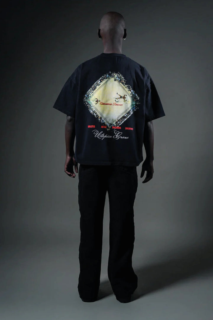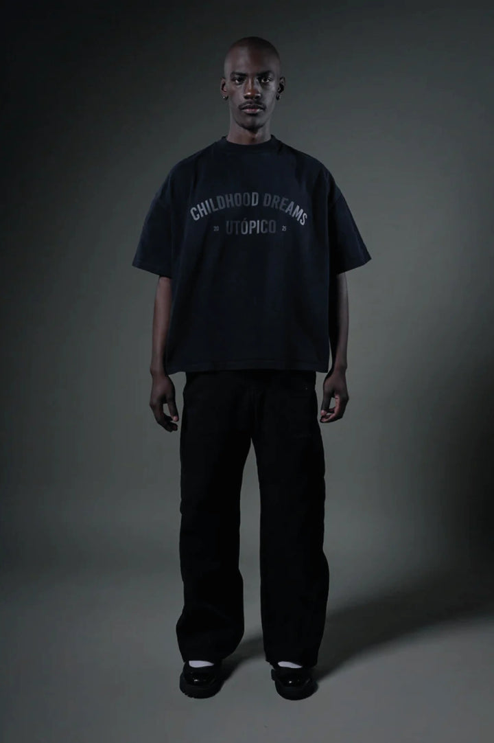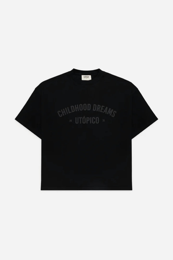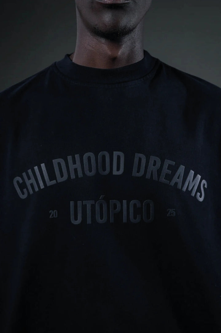 El estampado en alta densidad aporta definición y contraste sobre el fondo negro profundo, reforzando el sello gráfico utópico de la colección. El cuello en rib completa la pieza, brindando ajuste y durabilidad con un acabado limpio.